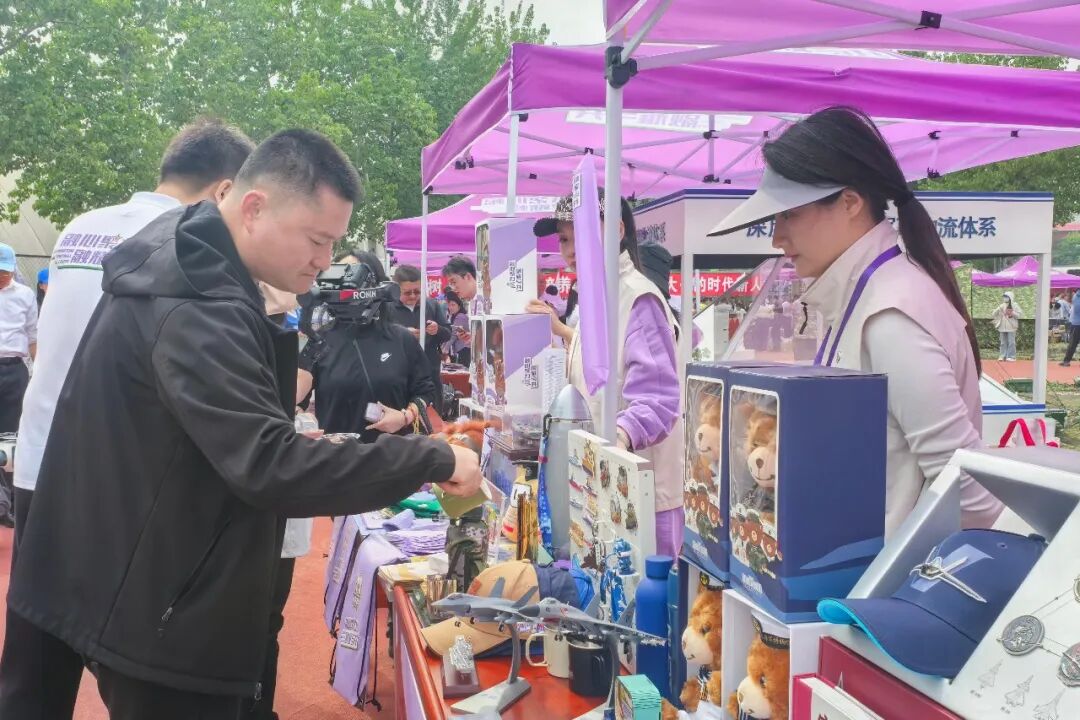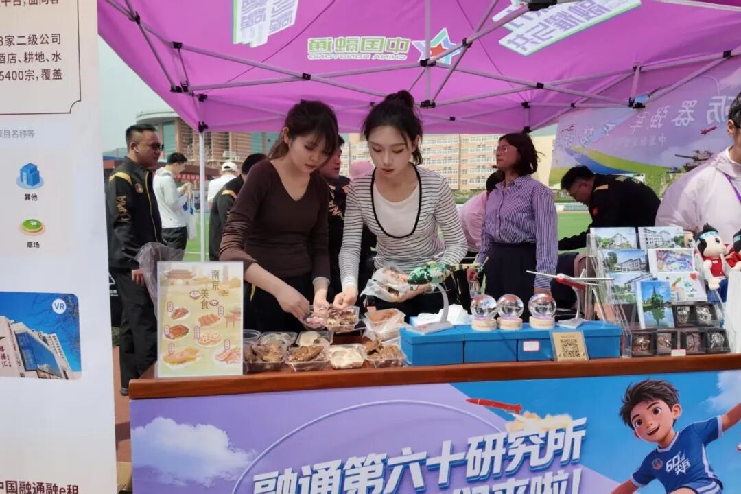 融通第六十研究所展示无人机模型、文创产品,以及来自南京的美食,并现场介绍公司产品。
