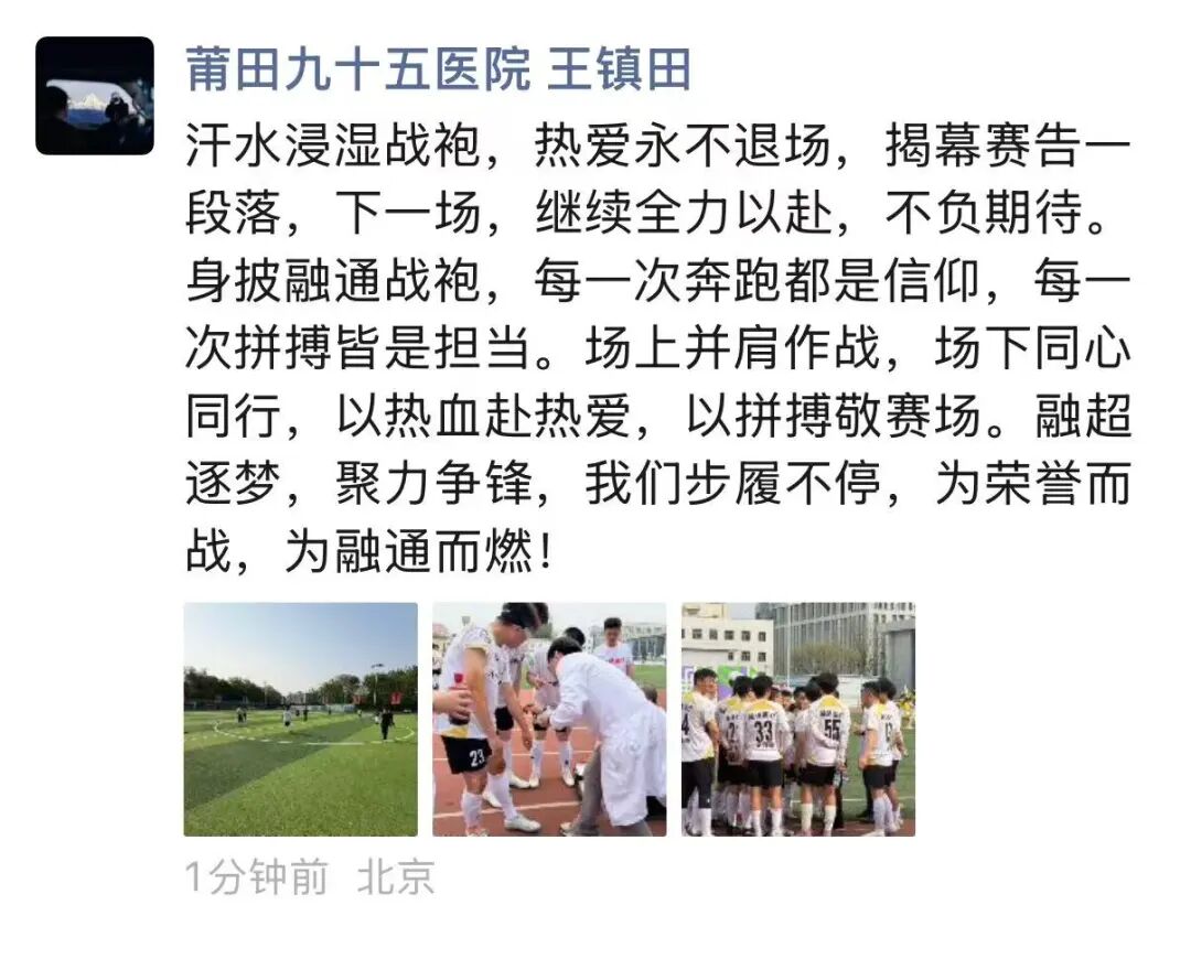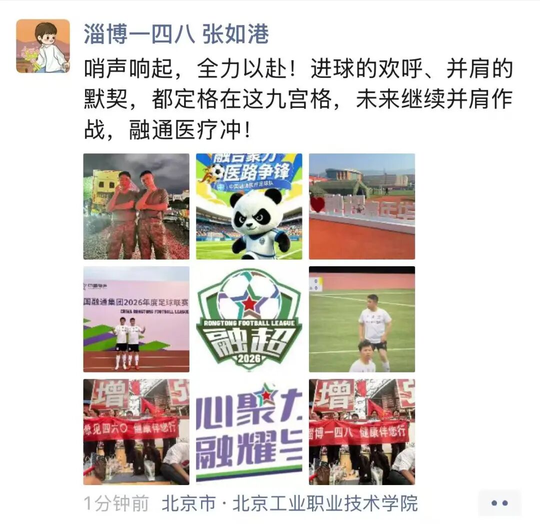 “哨声响起,全力以赴!进球的欢呼、并肩的默契,都定格在这九宫格,未来继续并肩作战,融通医疗冲!”