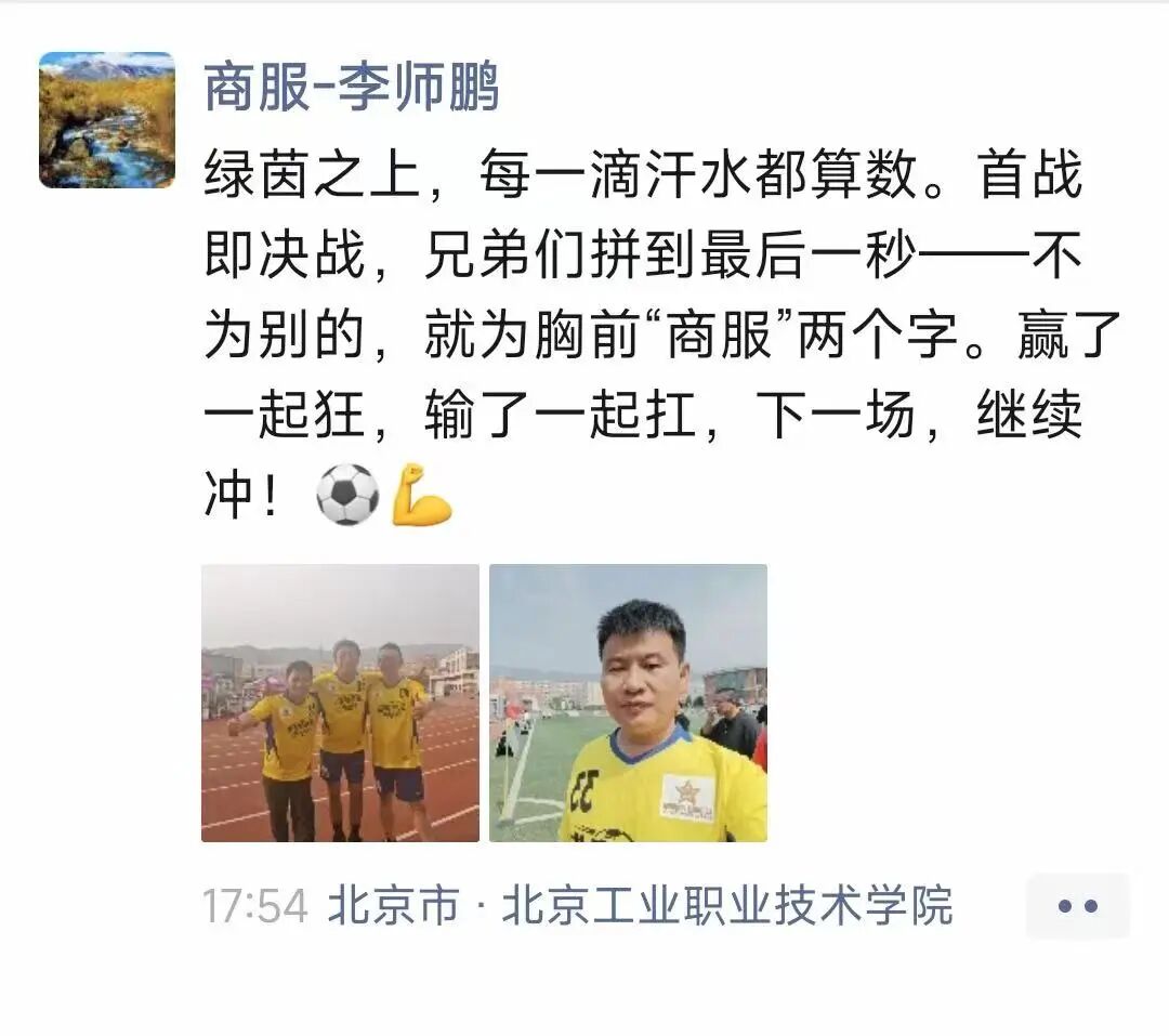 “绿茵之上,每一滴汗水都算数。首战即决战,兄弟们拼到最后一秒——不为别的,就为胸前‘商服’两个字。下一场,继续冲!”