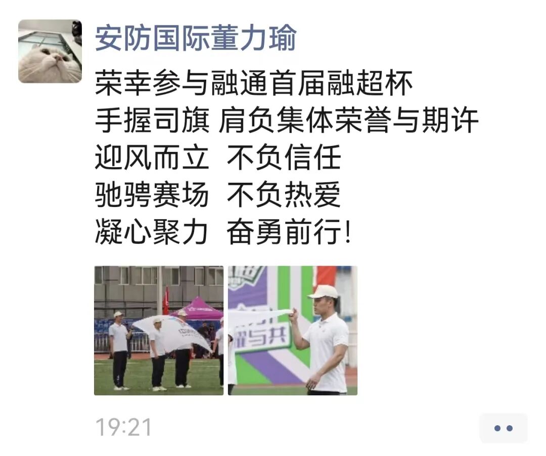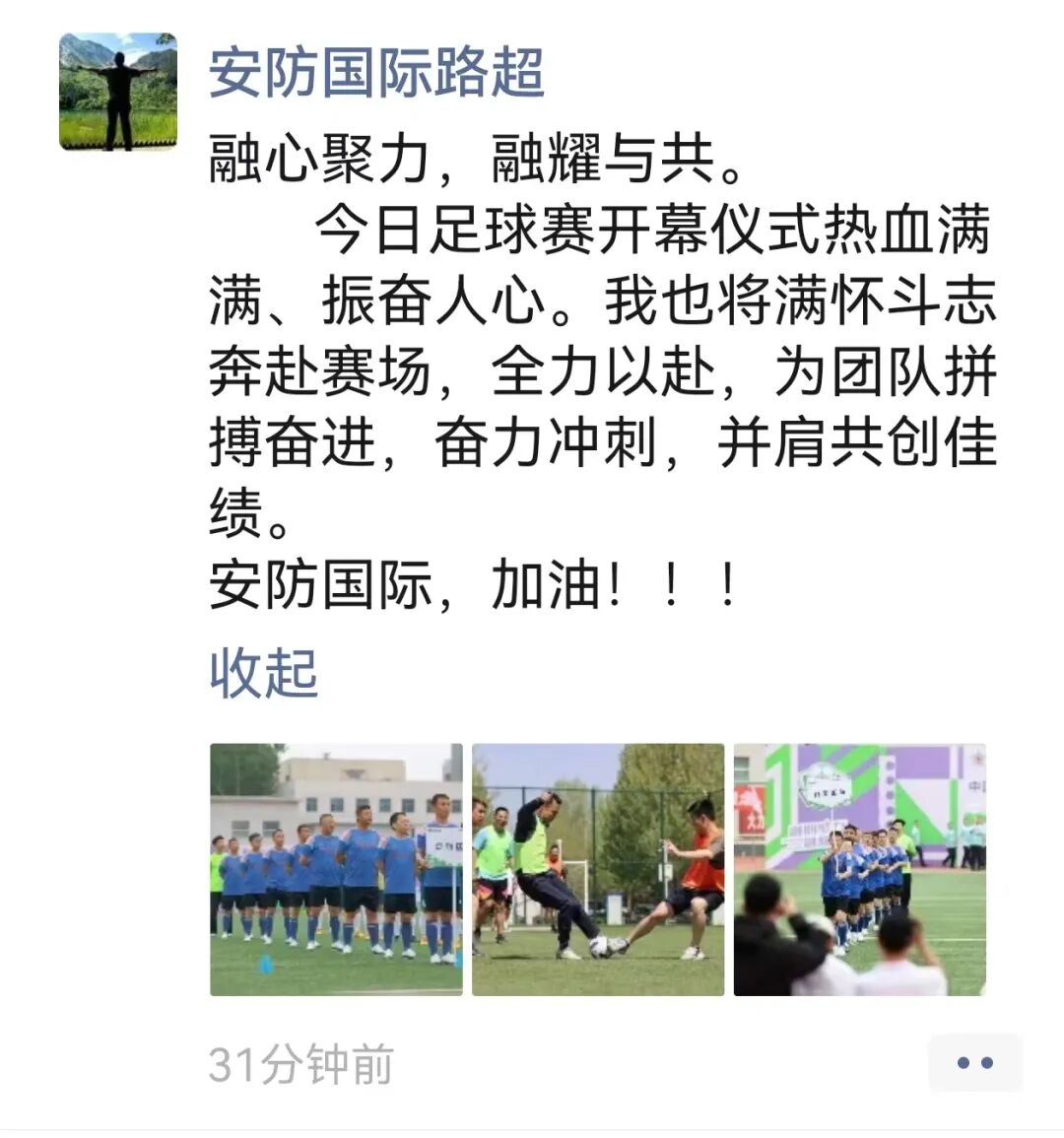 “今日足球赛开幕仪式热血满满、振奋人心。我也将满怀斗志奔赴赛场,全力以赴,并肩共创佳绩。安防国际,加油!”
