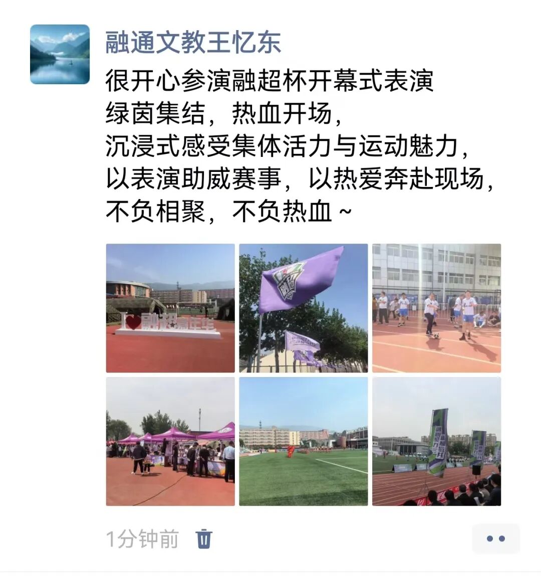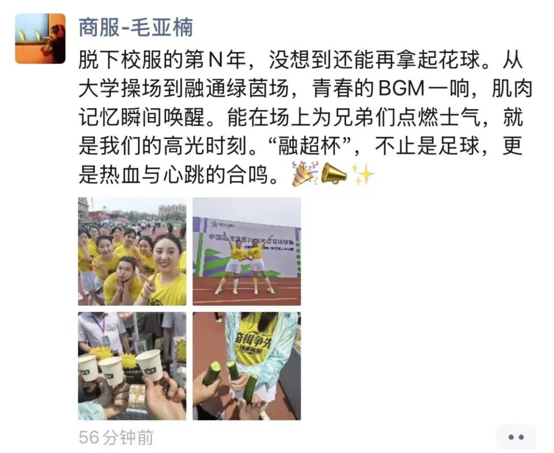 “从大学操场到融通绿茵场,青春的BGM一响,肌肉记忆瞬间唤醒。能在场上为兄弟们点燃士气,就是我们的高光时刻。”