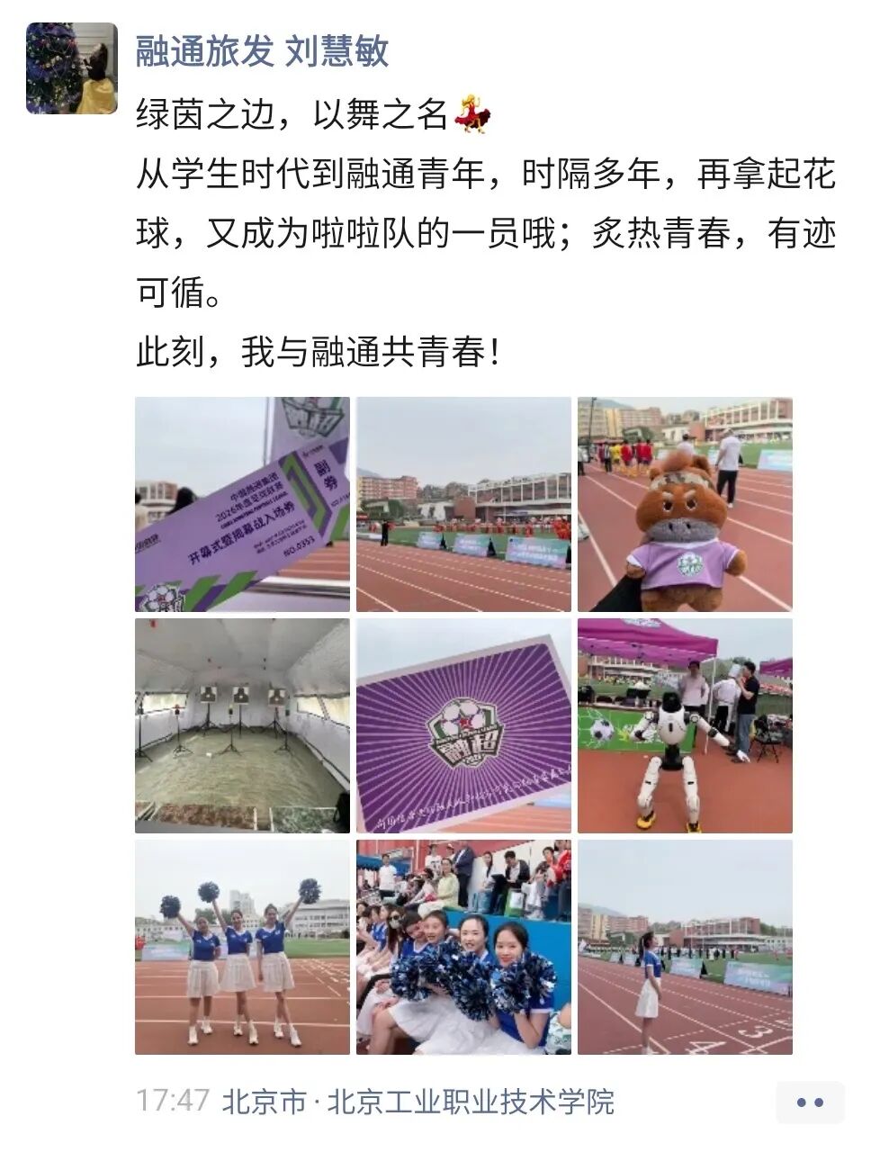 “从学生时代到融通青年,时隔多年,再拿起花球,又成为啦啦队的一员哦。此刻,我与融通共青春!”