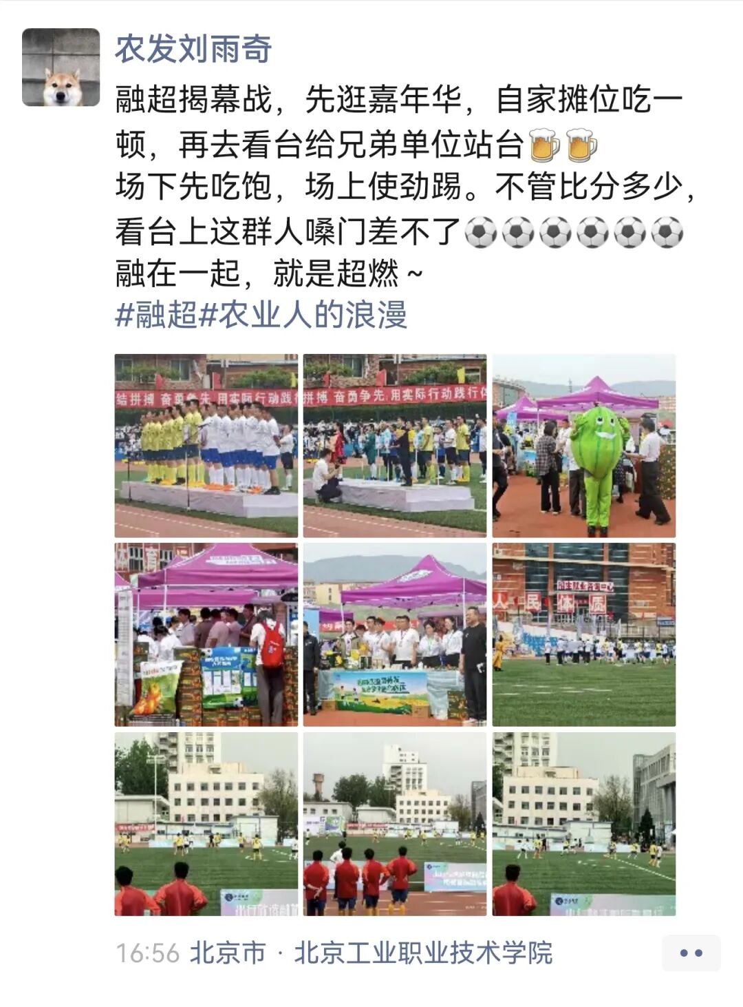 “融超揭幕战,先逛嘉年华,自家摊位吃一顿,再去看台给兄弟单位站台。场下先吃饱,场上使劲踢。不管比分多少,看台上这群人嗓门差不了。”