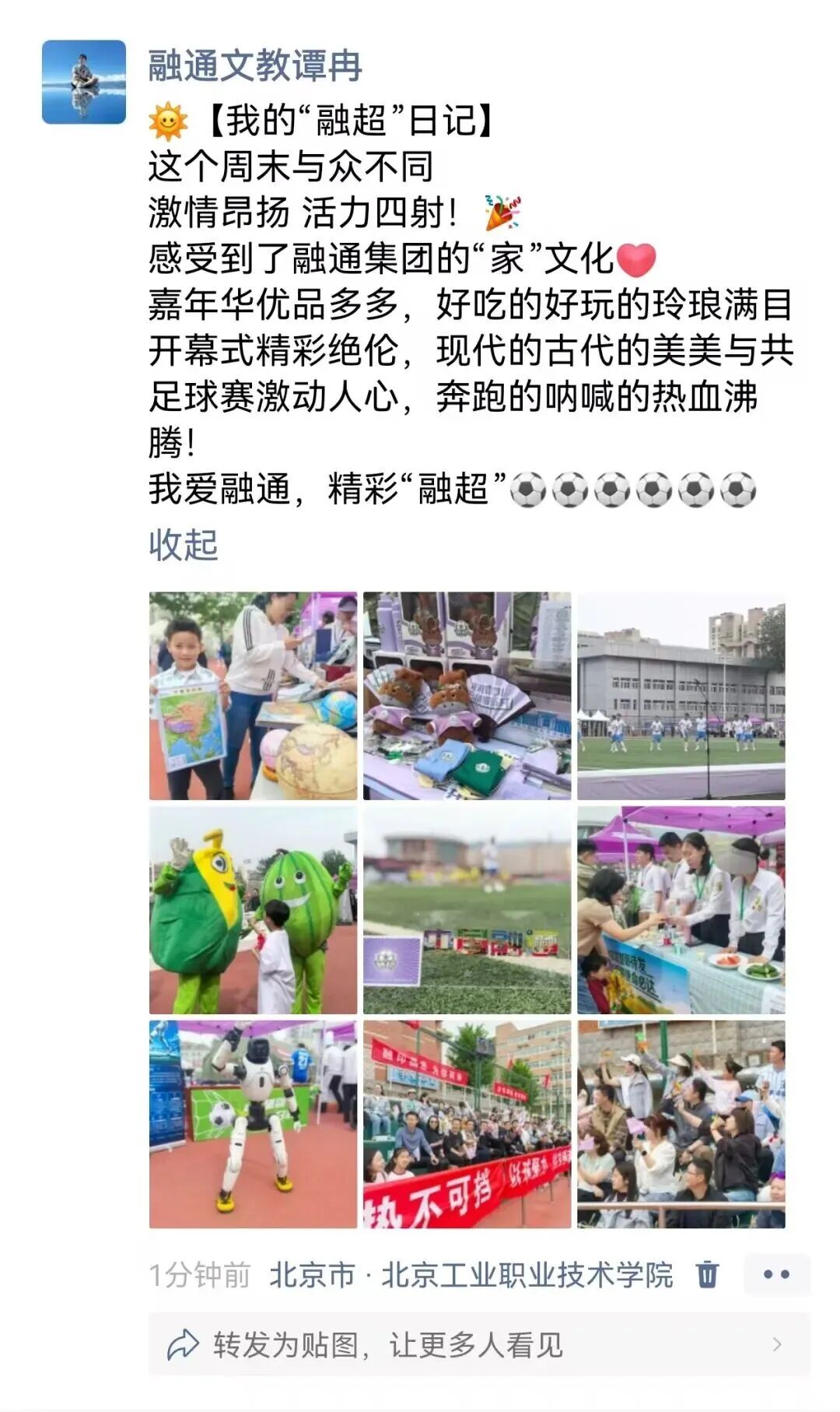 “这个周末与众不同,激情昂扬活力四射!感受到了融通集团的‘家’文化,嘉年华优品多多,好吃的好玩的琳琅满目,开幕式精彩绝伦。我爱融通,精彩融超!”