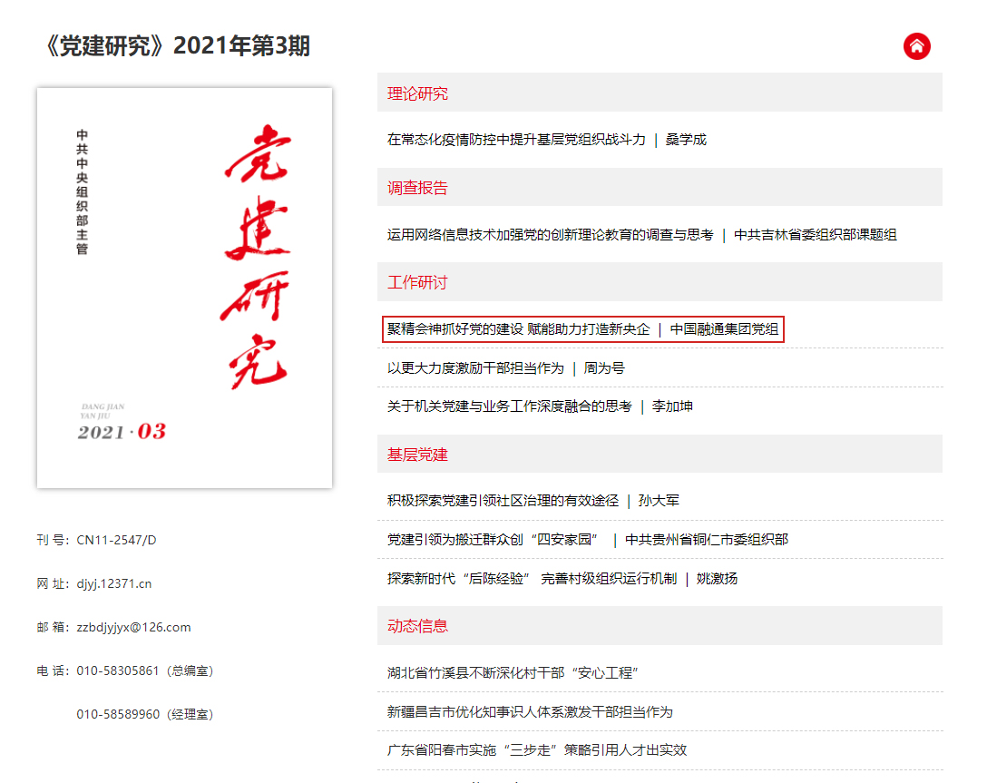 近日,中共中央组织部主管的杂志《党建研究》2021年第3期刊登中国融通集团党组文章《聚精会神抓好党的建设 赋能助力打造新央企》。全文如下: