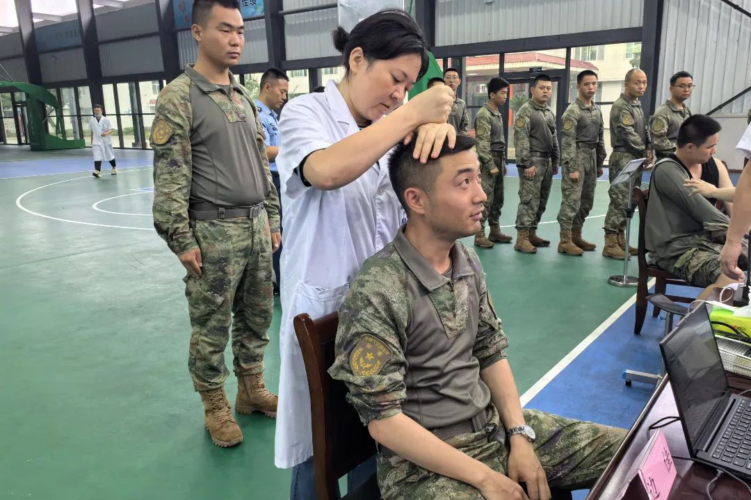就诊点设在营区运动馆内,半露天的场馆空旷明亮,雨后略显闷热,此起彼伏的蝉鸣声充满整个夏日。医护人员小心翼翼地抬运物资进场,分门别类安置妥当。在采集处、中医骨科和疼痛康复科的桌子上,一台台包装严密的诊疗设备被医护人员小心拿出、仔细调试。