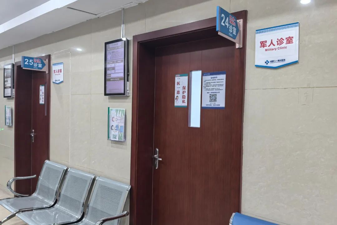 从踏进成都八一骨科医院门诊大厅开始,“军”字就无处不在。墙上、玻璃上、标牌上、门头上、大屏上、座位上,处处都有“军人第一、军属优先”“军人专属”等字样,大厅悬挂的标牌上也清晰地展示了为军“五个一”服务、“五个零、六优先”政策、军人军属就诊流程等为军服务内容。