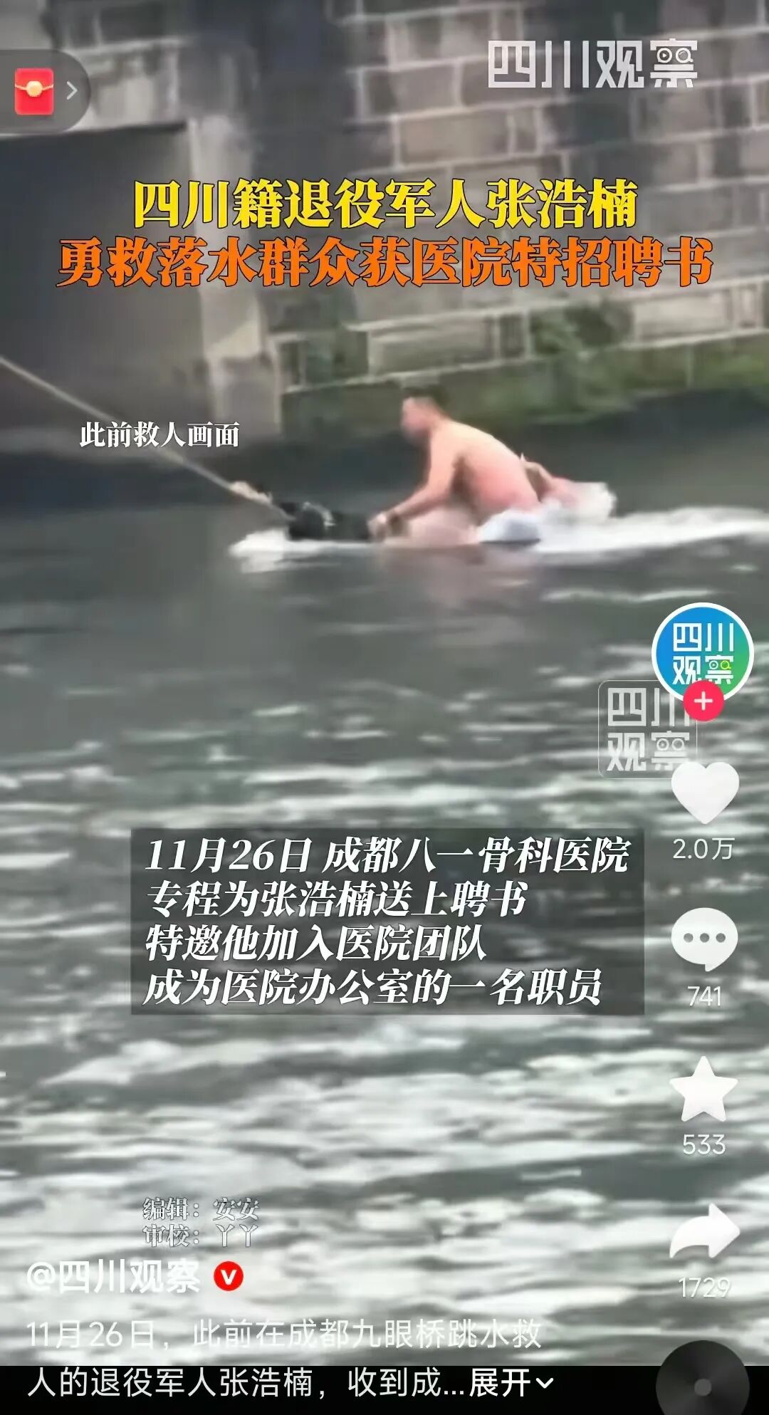 近日,退役军人张浩楠奋不顾身跃入成都市锦江勇救两名落水群众的事迹引发广泛关注。融通医疗健康在了解张浩楠的实际情况后,由所属成员单位成都八一骨科医院为他递上一份特招聘书,诚挚欢迎他在融通医疗健康新“站位”上续写忠诚本色。这不仅是一次对英雄的真情致敬,更是融通医疗健康将军队情怀、军人作风、英雄情结融入发展血脉的生动实践。